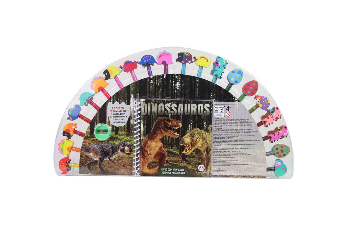 Divirta-se a valer com este kit de colorir! Além de um livro cheio de dinossauros para colorir e de atividades, você vai encontrar lápis de cor, borrachas coloridas e em formato de dinossauros, e um apontador! Não é demais?