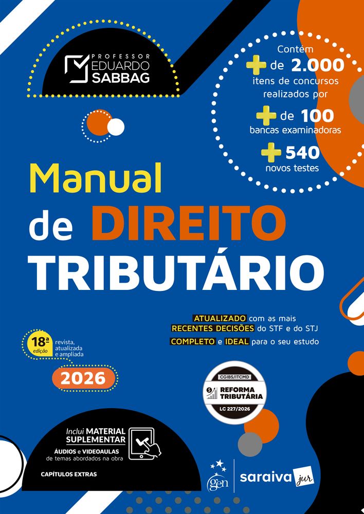 Com a experiência adquirida em cerca de vinte anos de magistério, o Professor Eduardo Sabbag traz à comunidade jurídica o seu esperado Manual, oferecendo uma nova perspectiva ao ensino do Direito Tributário no Brasil. O livro se destina aos operadores do Direito em geral, com ênfase naqueles que buscam êxito em concursos públicos, seja da área jurídica, seja da área fiscal, além de ser bastante útil aos estudantes da graduação e da pós-graduação. Representa uma ferramenta de auxílio ao advogado na prática diária do Direito Tributário. Em suas páginas, a disciplina é estudada em pormenores, de forma densa e reflexiva, tanto na Constituição Federal como no Código Tributário Nacional, sem prescindir da abordagem clara e didática, característica das obras do autor. Temas como princípios, imunidades, tributos, decadência, prescrição, competência tributária, impostos em espécie e vários outros são estudados passo a passo, sempre ilustrados com a mais atual e abundante jurisprudência. Este Manual de Direito Tributário tem como particularidade, e diferencial, sua inovadora diagramação. A cada página, o leitor será conduzido, por meio de hiperlinks, a aspectos que já foram objeto de concursos públicos, o que enriquece substancialmente o entendimento da matéria sem a necessidade de interromper a leitura em busca das páginas reservadas às questões. Nesta 18ª edição, foi disponibilizado material extra em vídeo e áudio, em capítulos selecionados, acessível via QR Code, a fim de otimizar o aprendizado e a compreensão dos temas, um encarte de atualização jurisprudencial e cinco capítulos extras, disponibilizados na versão digital da obra. Trata-se de uma obra completa, inovadora, ampla e atualizada, essencial a qualquer biblioteca jurídica e àqueles que desejam aprofundar-se no estudo do Direito Tributário.