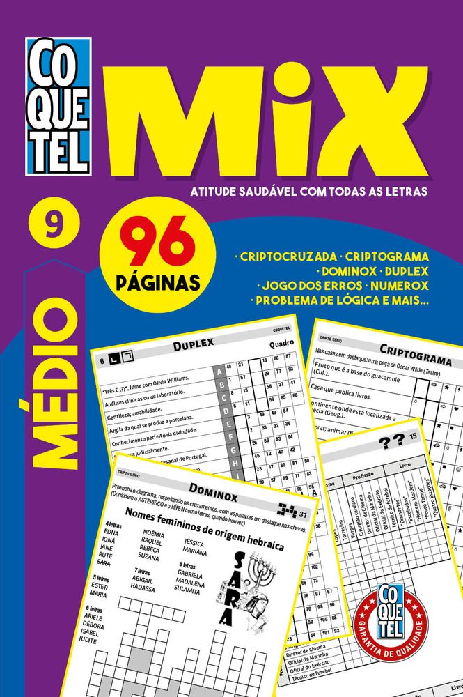Um clássico moderno: o passatempo que combina desafio, diversão e saúde mental! Nível médio 96 páginas Diversidade de passatempos: criptocruzadas, numerox, cruzadox, criptogramas, letrox, dominox, problema de lógica, sudoku, caça-resposta, duplex, batalha-naval e torto, entre outros. Ideal para adultos que buscam momentos de relaxamento com foco, concentração e estimulação cognitiva leve. O livro Coquetel Mixreúne o melhor dos passatempos clássicos em uma edição moderna e envolvente, perfeita para quem deseja exercitar o cérebro com leveza e prazer. Com 96 páginas e nível médio de dificuldade, esta coletânea inclui desafios variados como Criptocruzadas, Numerox, Cruzadox, Criptogramas, Letrox, Dominox, Jogo dos Erros, Problemas de Lógica, Sudoku, Caça-Resposta, Duplex, Batalha-Naval, Torto e outros formatos que estimulam diferentes áreas do raciocínio. Ideal para adultos que valorizam o tempo offline, querem manter a mente ativa e buscam uma alternativa saudável à rotina digital. Com a curadoria editorial da Coquetel, sinônimo de tradição e qualidade, esta edição é uma ótima escolha para leitores que desejam relaxar com inteligência e diversão.