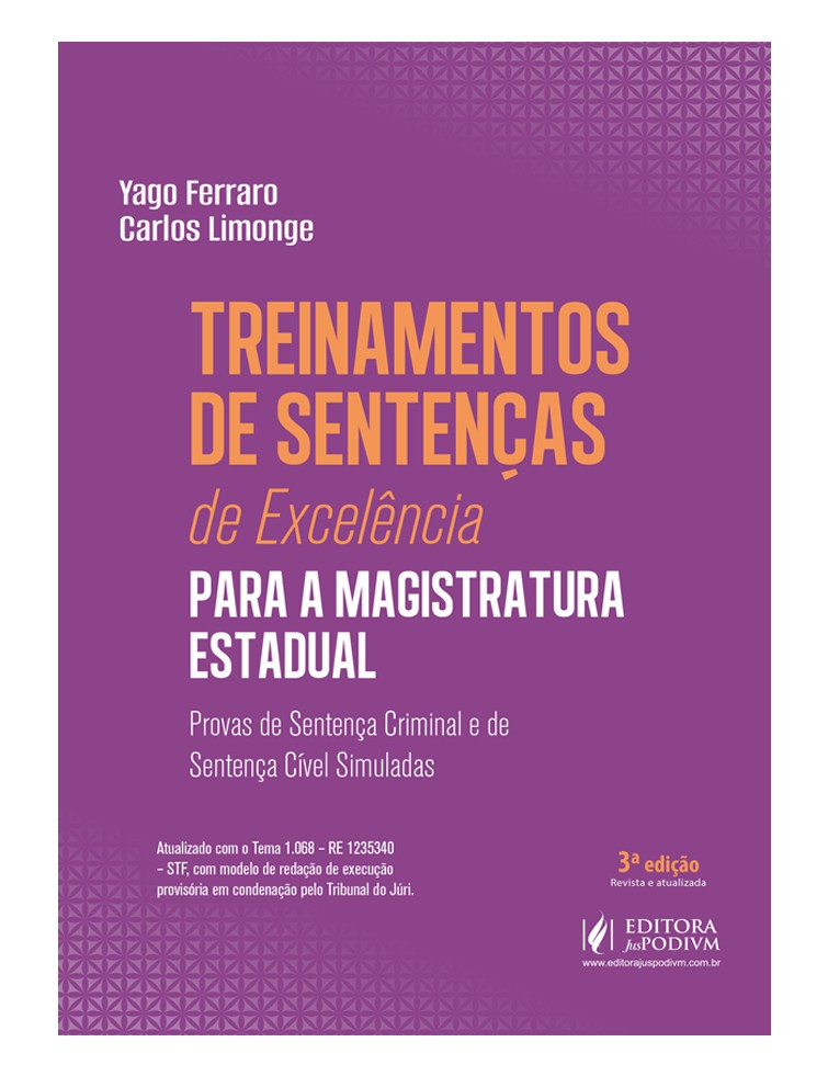 POR QUE ESCOLHER O LIVRO “TREINAMENTOS DE SENTENÇAS DE EXCELÊNCIA PARA A MAGISTRATURA ESTADUAL”? Este livro de treinos de sentenças penais e cíveis auxilia o candidato que busca a Magistratura Estadual por várias razões: são treinamentos especialmente projetados para atender às necessidades de candidatos aos concursos de Magistratura, proporcionando exercícios e exemplos específicos das provas. A prática contínua com sentenças penais e cíveis permite ao candidato desenvolver e aperfeiçoar habilidades importantes, a exemplo da argumentação jurídica, da aplicação do Direito ao caso concreto, a clareza na redação e a estruturação lógica das decisões. É uma ferramenta poderosa para candidatos que buscam uma preparação eficaz e direcionada para os concursos de Magistratura, aumentando suas chances de sucesso. Yago Ferraro - Uma obra destinada a todos os estudantes e profissionais do Direito que almejam uma preparação completa, robusta e eficaz para as provas de sentenças e para a prática forense. Com enunciados, espelhos e modelos de sentenças cuidadosamente elaborados, este livro se apresenta como uma ferramenta indispensável para todos que buscam excelência na elaboração de sentenças e uma preparação robusta para as provas de sentenças. Carlos Limonge