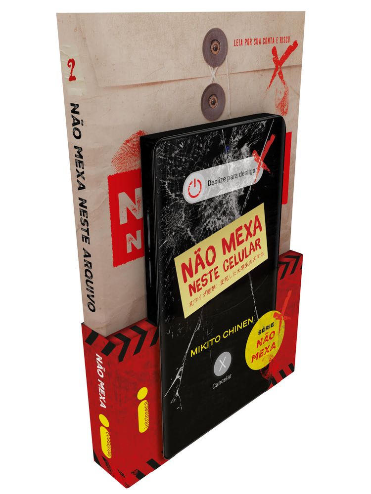 O melhor do terror japonês em uma experiência literária inovadora.Dois livros: celular + pasta de arquivosNa sérieNão mexa, os piores pesadelos podem estar nos objetos mais simples: uma latinha de bebida, uma revista, ou até mesmo… seu celular, que passa o dia inteiro colado com você. EmNão mexa neste celular, o leitor tem acesso ao telefone de Kazuma Isshiki, no formato exato de um smartphone. O jovem universitário quer muito arranjar um emprego para conseguir morar com a namorada, mas, durante uma aventura que pode ajudá-lo a conseguir um trabalho, acaba se deparando com algo assustador. No livro, a experiência imersiva intercala texto e capturas de tela de celular, convidando quem lê a adentrar uma história sinistra.Não mexa neste arquivo apresenta uma narrativa dinâmica, construída a partir de transcrições de entrevistas e registros da avaliação psiquiátrica do autor de um assassinato em massa que choca todo o Japão. Transtornado pela crença de que está sendo constantemente observado por um monstro, o assassino se mostra inquieto, paranoico, e seu estado mental o leva a tomar medidas drásticas. Mas o que seria essa entidade misteriosa capaz de deixar alguém com tanto medo?Depois de ler os dois livros — celular e pasta de arquivos —, vários pontos suspeitos e ocorrências à primeira vista aleatórias passam a se conectar. Entre plantas baixas, reportagens, imagens sinistras e outros documentos inquietantes, aos poucos a verdade por trás desses casos completamente bizarros vai se revelando. Para descobrir o segredo por completo, basta embarcar nessa experiência literária inovadora e macabra. Apenas lembre-se de que toda escolha tem consequências.