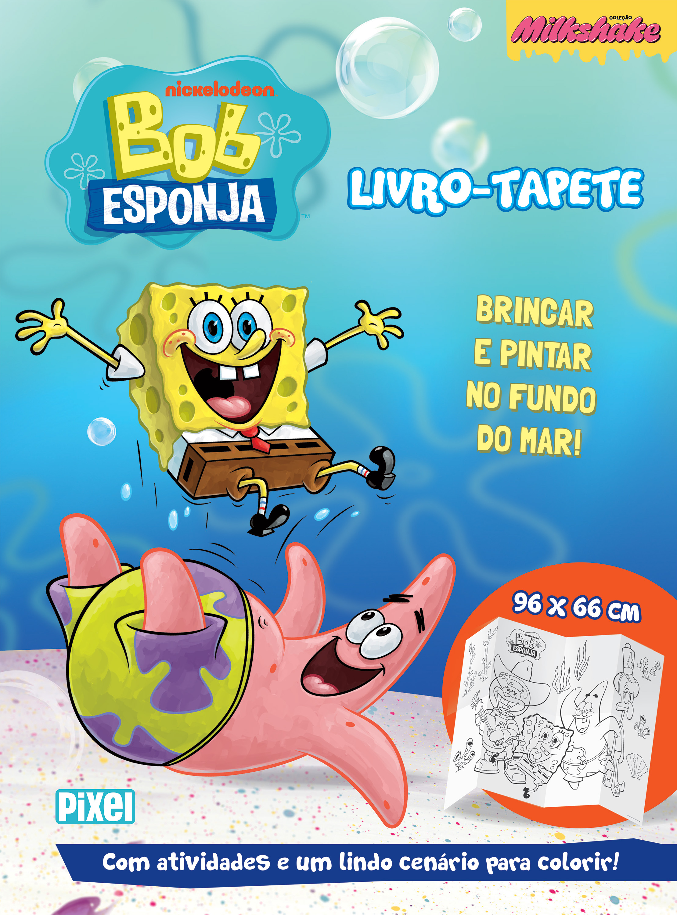 Bob Esponja, Patrick e toda a turma da Fenda do Biquíni convidam você, pequeno leitor, a mergulhar em um mar de brincadeiras que podem ser compartilhadas neste superlivro! Basta desdobrar as páginas para que um grande tapete surja, repleto de jogos e diversão para toda a família e os amigos! Com uma superilustração de 96 x 66 cm, o convite é para pintar e resolver os variados passatempos da publicação. O formato diferente estimula a criatividade e contribui com o desenvolvimento cognitivo e motor das crianças, favorecendo habilidades como raciocínio lógico e percepção visual. Então venham todos brincar de montão com este livro-tapete e compartilhar não só as atividades, mas também a alegria dos personagens mais queridos do fundo do mar!